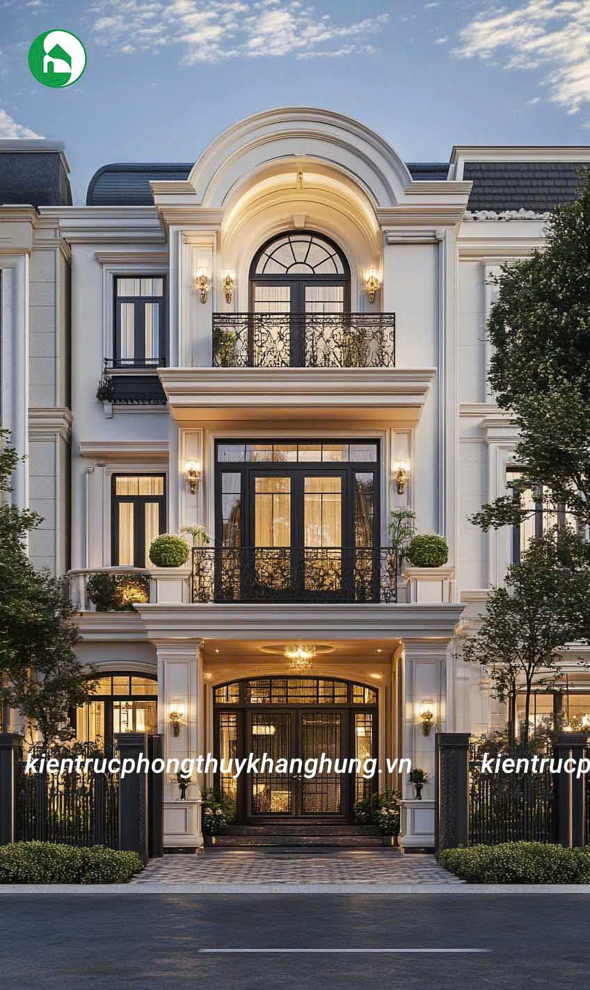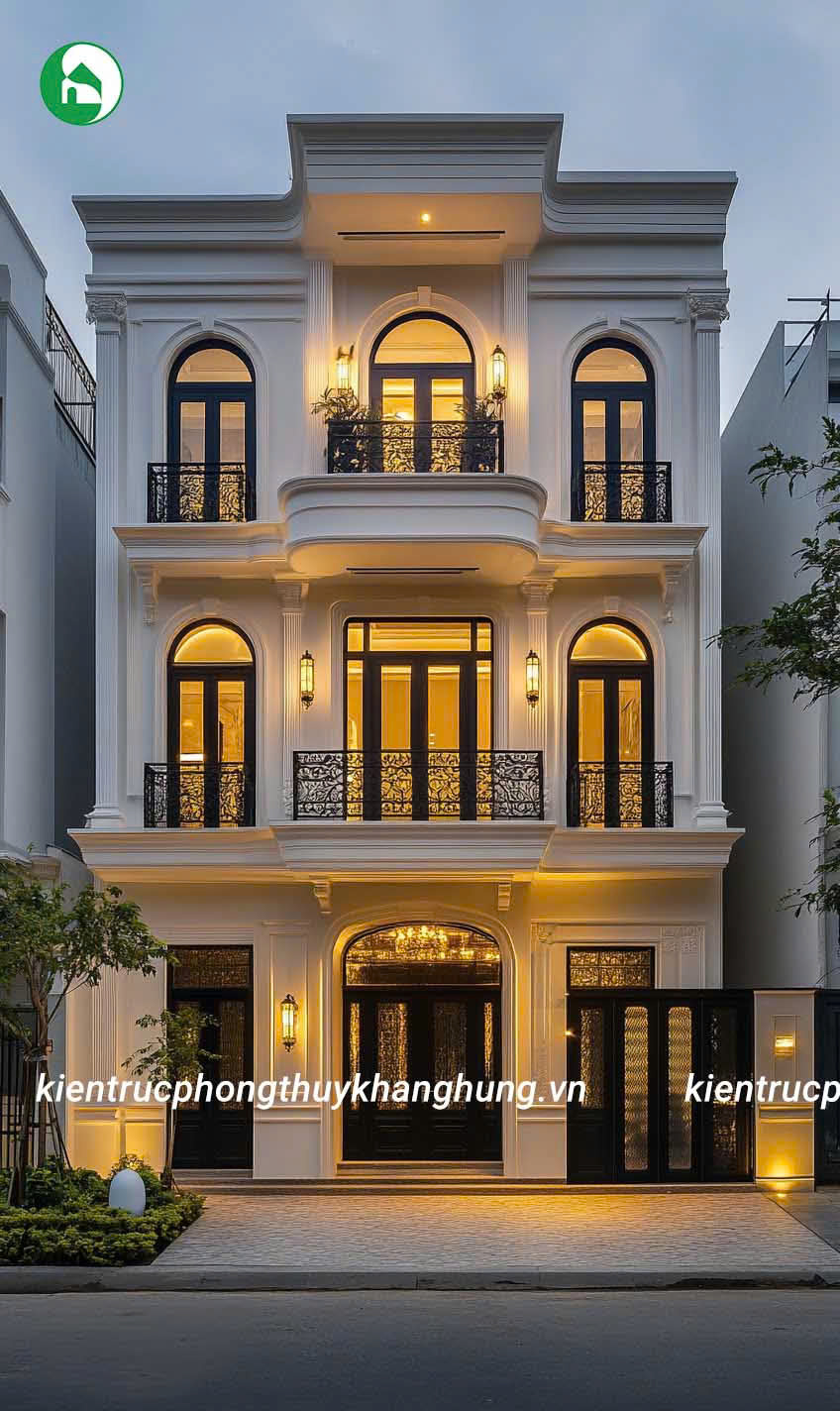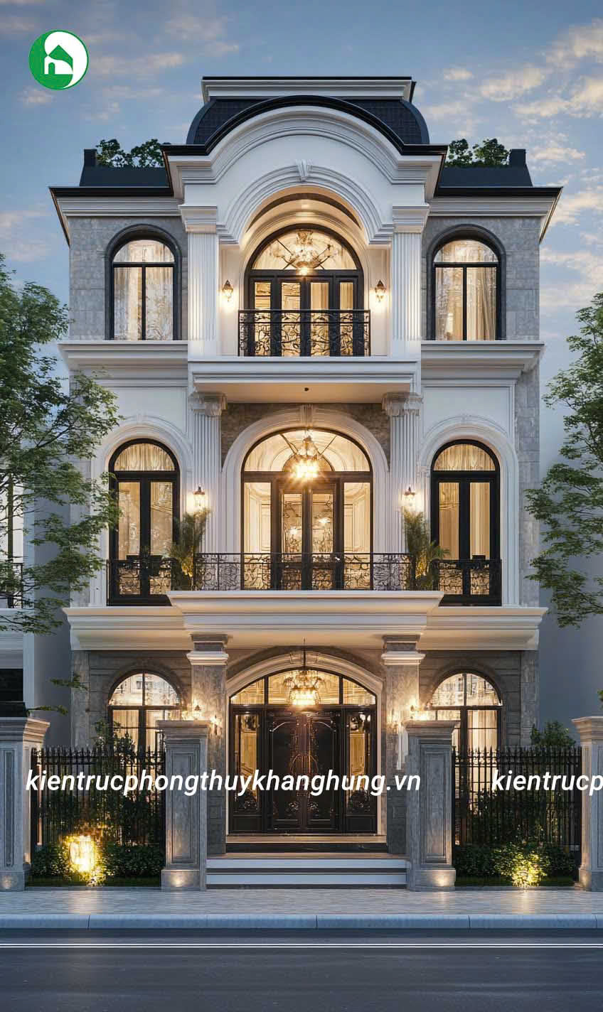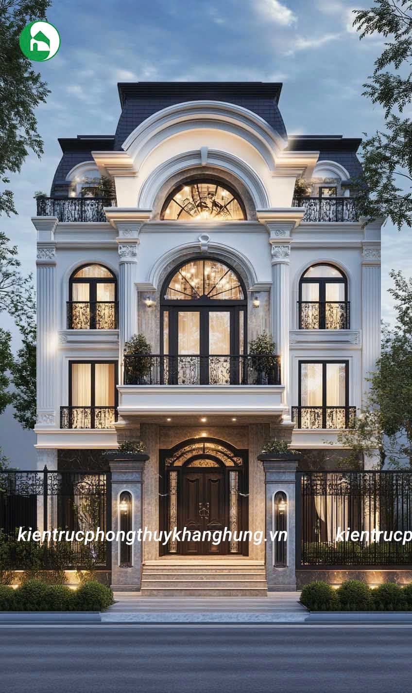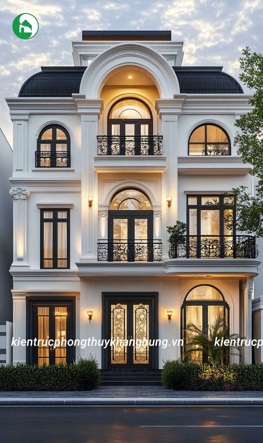 Biệt thự 3 tầng tân cổ điển tại Kiến Trúc Phong Thủy Khang Hưng được thiết kế với những đường nét hoa văn tinh tế, kết hợp giữa kiến trúc cổ điển và hiện đại. Mái vòm, thức cột vững chãi, cùng hệ thống phào chỉ tinh xảo tạo nên vẻ đẹp sang trọng, cuốn hút, nhưng không kém phần thanh lịch, tinh tế.