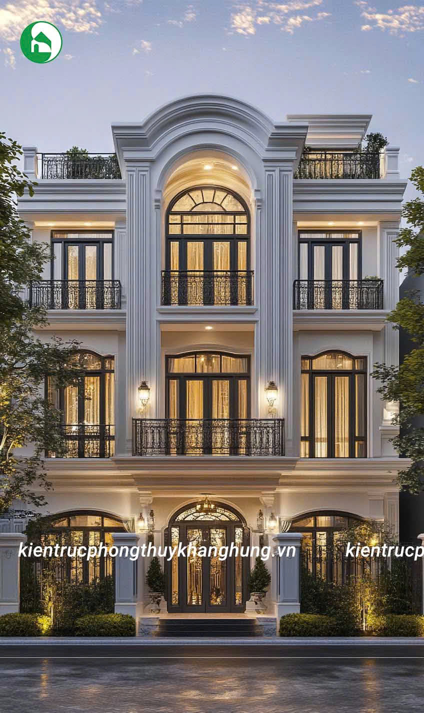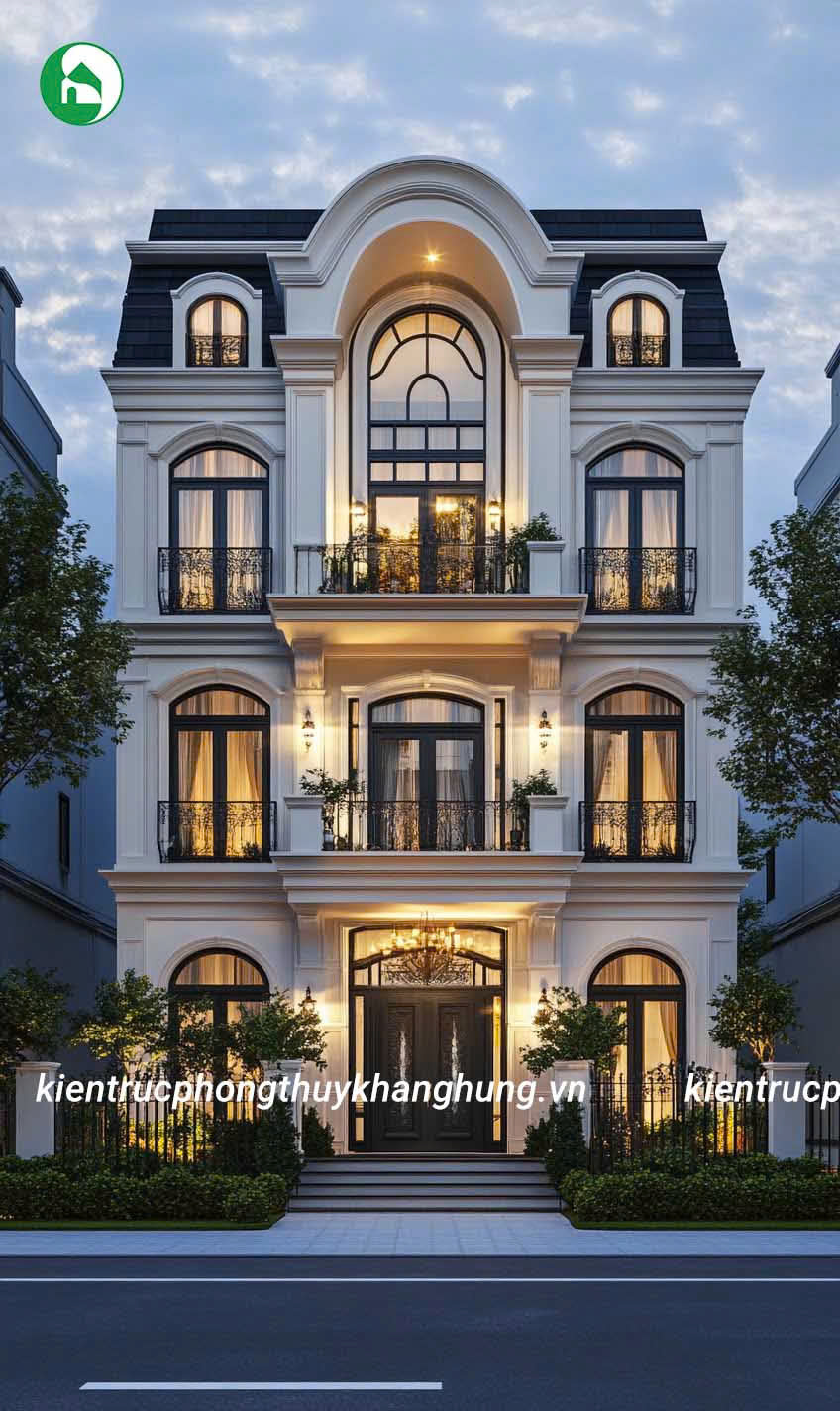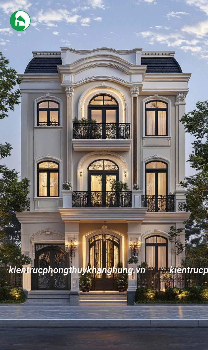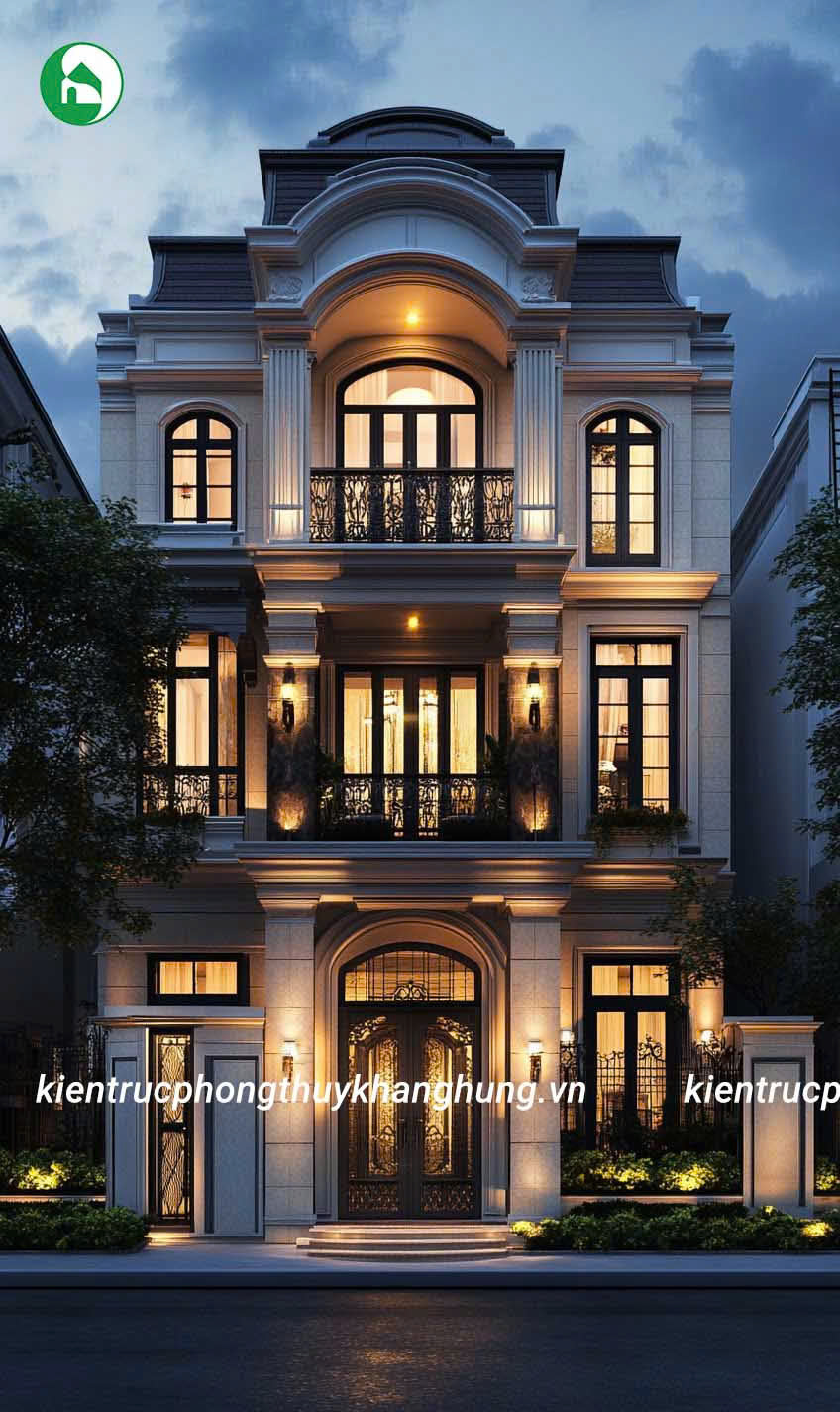 Biệt thự 3 tầng tân cổ điển tại Kiến Trúc Phong Thủy Khang Hưng được thiết kế với những đường nét hoa văn tinh tế, kết hợp giữa kiến trúc cổ điển và hiện đại. Mái vòm, thức cột vững chãi, cùng hệ thống phào chỉ tinh xảo tạo nên vẻ đẹp sang trọng, cuốn hút, nhưng không kém phần thanh lịch, tinh tế.