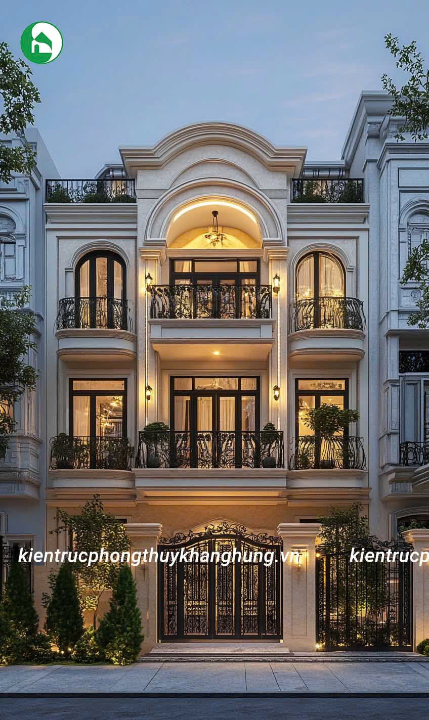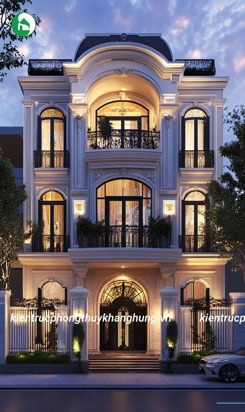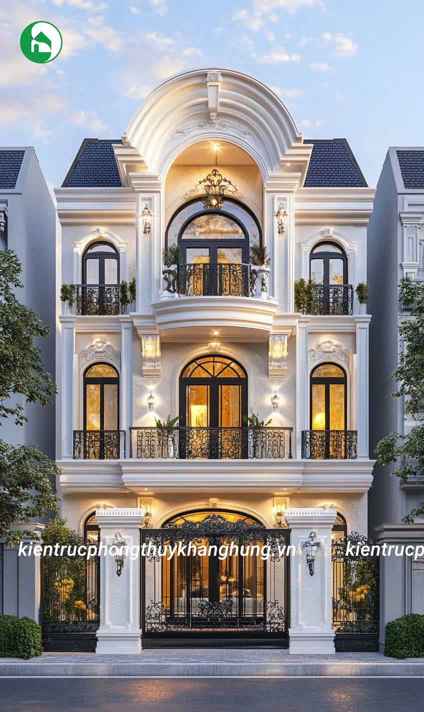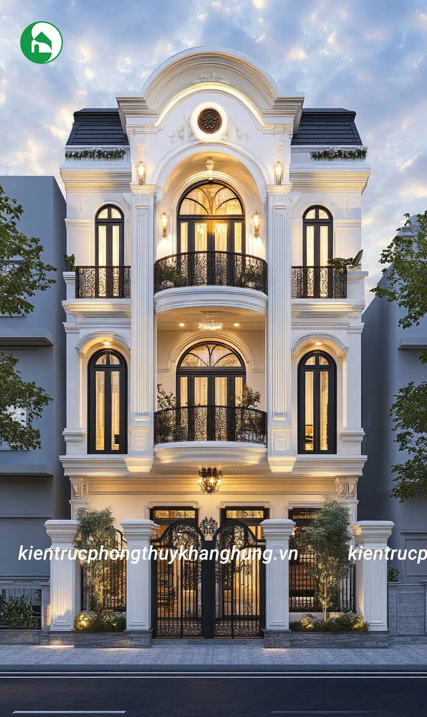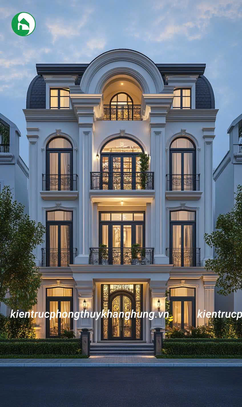 Biệt thự 3 tầng tân cổ điển tại Kiến Trúc Phong Thủy Khang Hưng được thiết kế với những đường nét hoa văn tinh tế, kết hợp giữa kiến trúc cổ điển và hiện đại. Mái vòm, thức cột vững chãi, cùng hệ thống phào chỉ tinh xảo tạo nên vẻ đẹp sang trọng, cuốn hút, nhưng không kém phần thanh lịch, tinh tế.