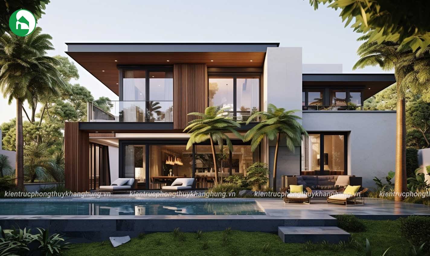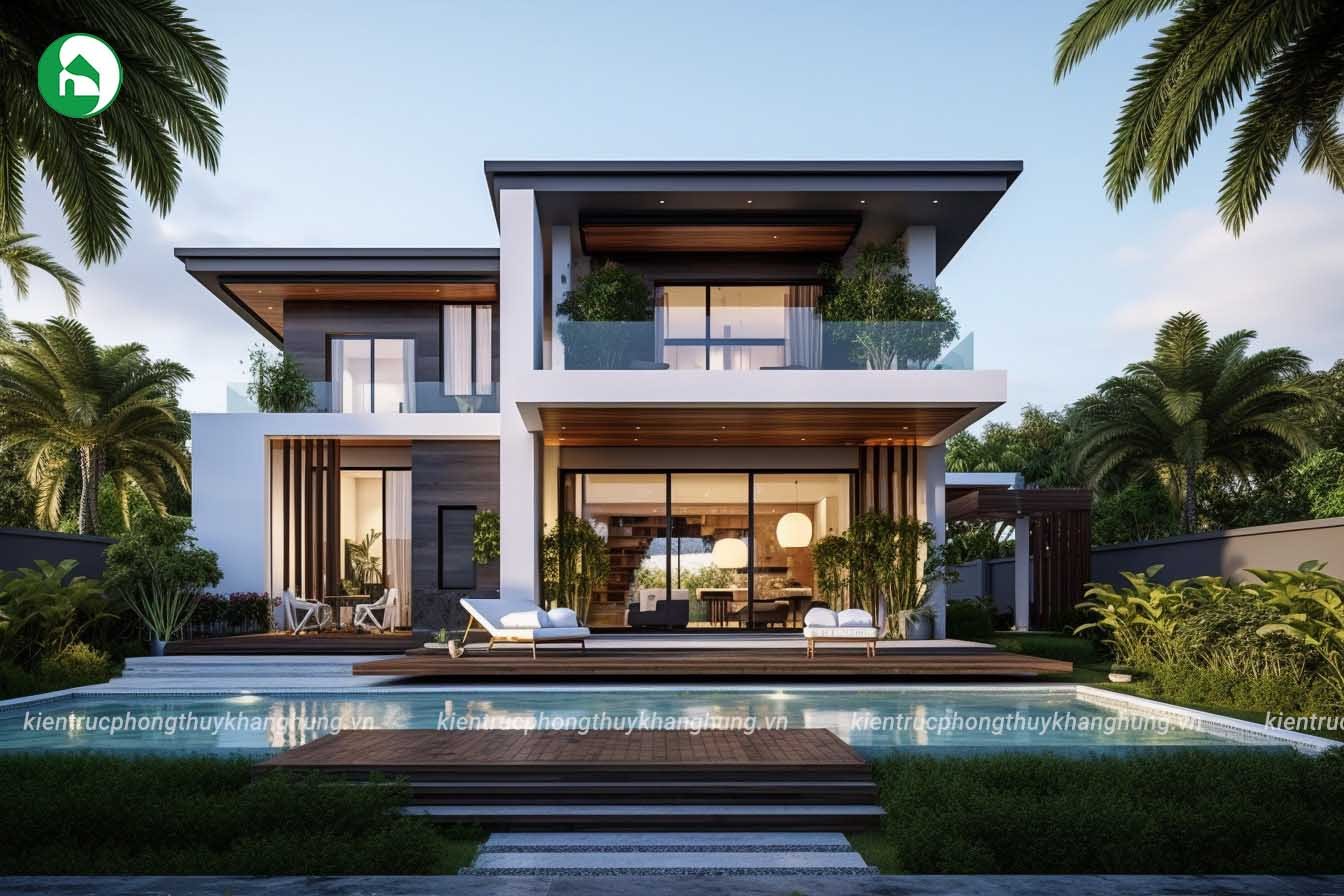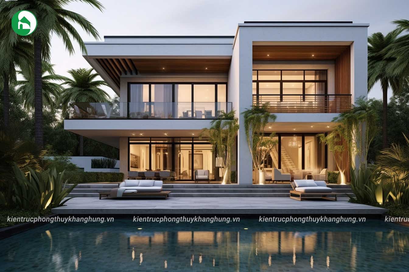 Thiết kế nhà mái bằng 2 tầng hiện đại tại Kiến Trúc Phong Thủy Khang Hưng còn chú trọng vào việc tạo ra không gian ngoại thất ấn tượng. Khu vườn xanh mát, hồ bơi tiện lợi, và các khu vực giải trí ngoại thất được xây dựng để gia tăng giá trị sống và tận hưởng không gian xanh tự nhiên.