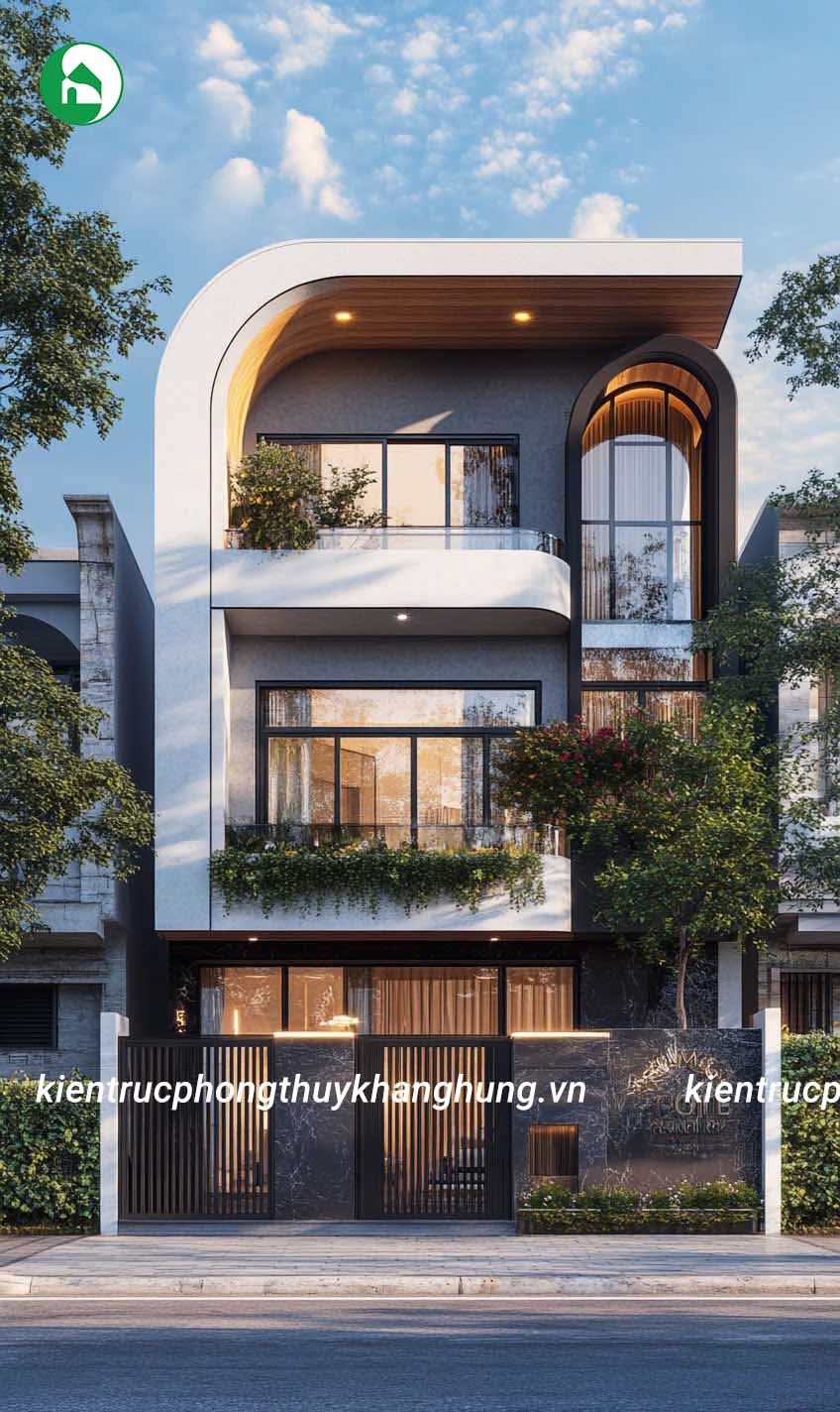 Mẫu nhà phố hiện đại 3 tầng này gây ấn tượng mạnh mẽ với thiết kế đường cong tinh tế và vẻ đẹp tối giản.