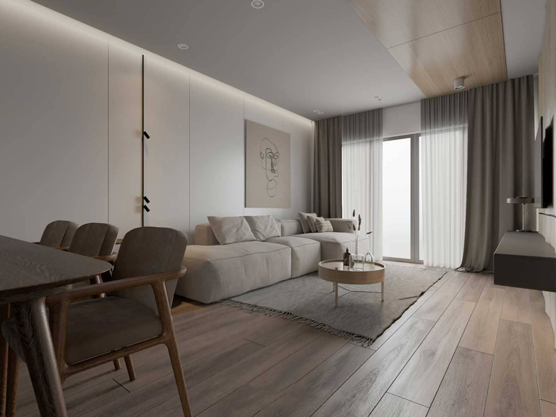 Không chỉ giảm thiểu về số lượng vật dụng và chi tiết trang trí, phong cách thiết kế tối giản còn tập trung vào việc sử dụng màu sắc một cách cẩn thận và hiệu quả. Thay vì áp dụng nhiều màu sắc khác nhau với tone ấm và nóng, thiết kế căn hộ theo phong cách tối giản chỉ chọn lựa 2-3 màu sắc cho cùng một phối cảnh. Tỉ lệ này được duy trì theo quy tắc 60% màu chủ đạo, 30% màu trung gian và 10% màu nhấn. Điều này tạo ra sự cân bằng hài hòa giữa các gam màu và giúp không gian trở nên ổn định và trực quan.