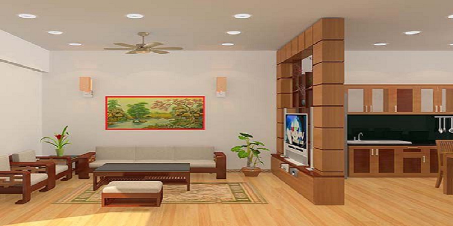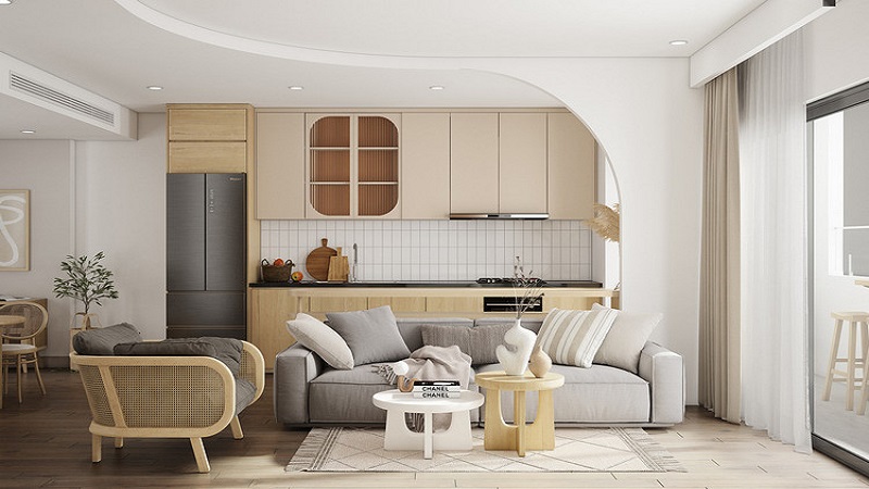 Thiết kế phòng khách và bếp thông nhau tiết kiệm diện tích