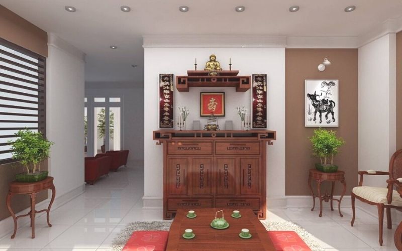 Đặt bàn thờ đối diện với cửa ra vào và dựa vào một bức tường chắc chắn không chỉ tôn kính tổ tiên mà còn giúp ngăn chặn luồng khí tốt trong nhà bị phân tán.giúp Bên cạnh đó cũng giúp tăng cường sự ổn định và bảo vệ gia đình khỏi các yếu tố tiêu cực.