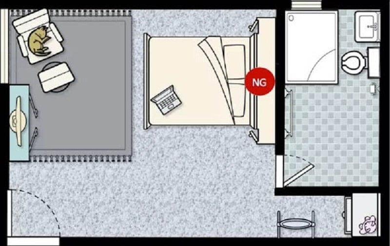 Cách hóa giải: Hãy thay đổi vị trí giường để đầu giường không còn hướng thẳng vào bồn cầu hoặc bức tường phía sau.