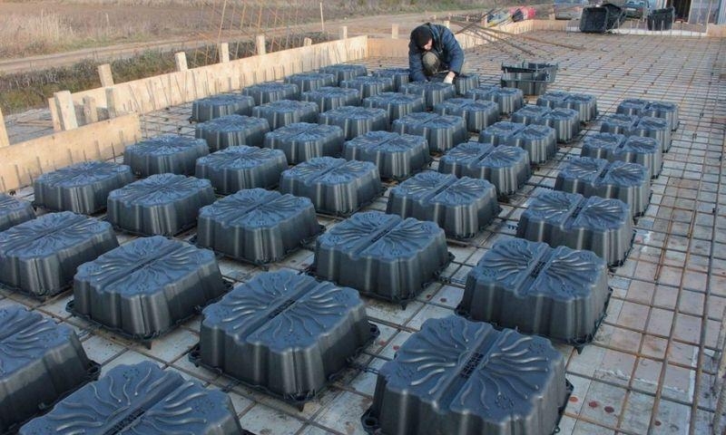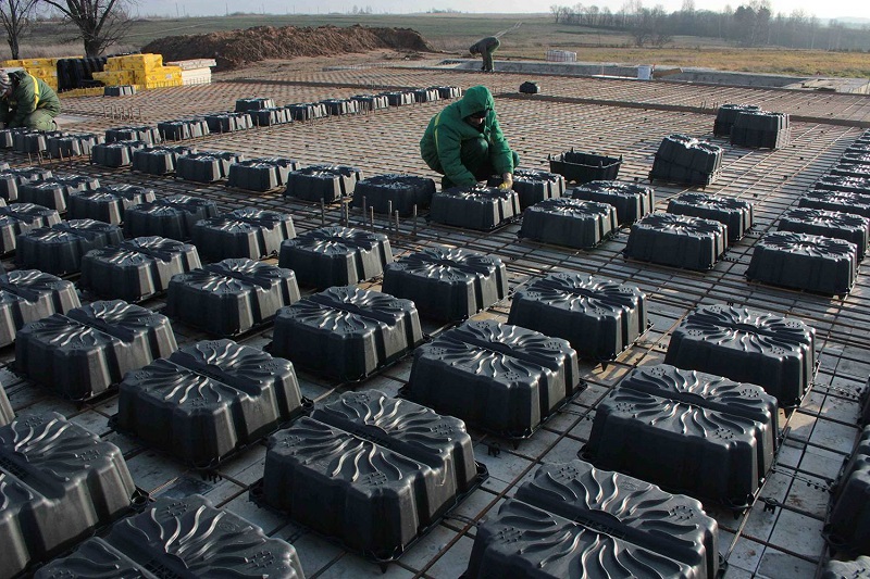 Bước 2: Lắp Đặt Hộp Nhựa và Thép Lớp Giữa Hệ Thống Dầm: Được tạo ra bằng cách định vị và lắp đặt hộp nhựa bằng thanh nối, tạo ra hệ thống dầm ở giữa hai hộp. Các thành phần thép mũ cột, thép gia cường, và thép lớn cũng được lắp đặt theo bản vẽ thiết kế.