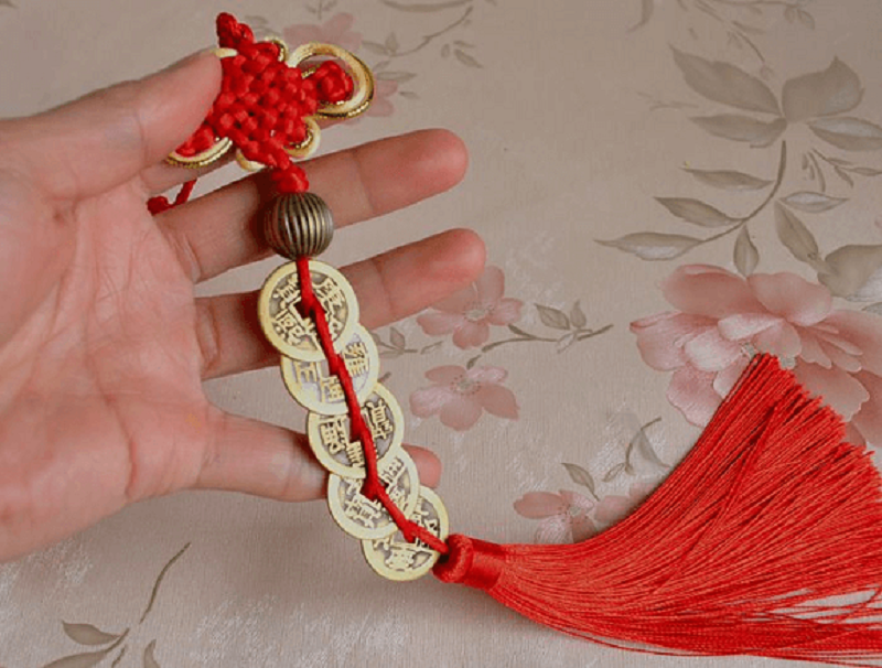 2. Treo Tiền Xu Ngũ Đế: Treo tiền xu Ngũ Đế (ngũ hành) dưới cửa nhà cũng là một cách hữu ích để tăng thêm sức mạnh hóa giải sát khí. Ngũ Đế đại diện cho năm yếu tố ngũ hành trong phong thủy: Mộc, Hỏa, Thổ, Kim, và Thủy, giúp cân bằng và làm dịu các năng lượng tiêu cực.