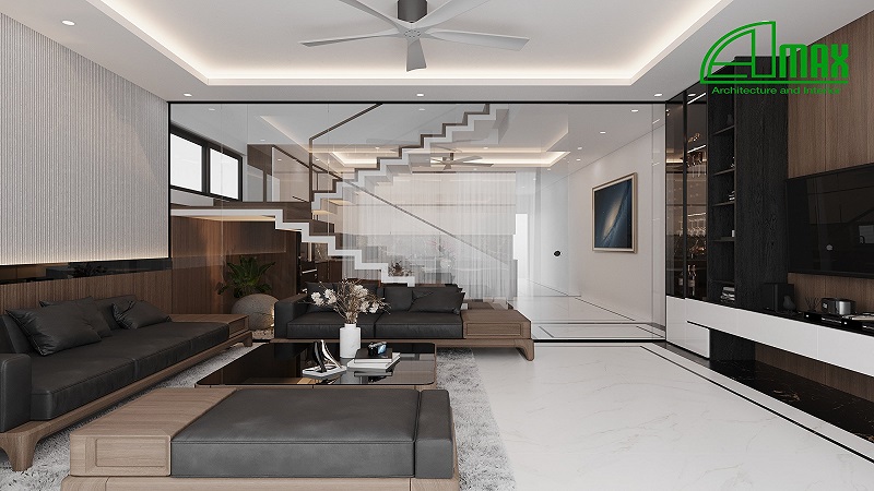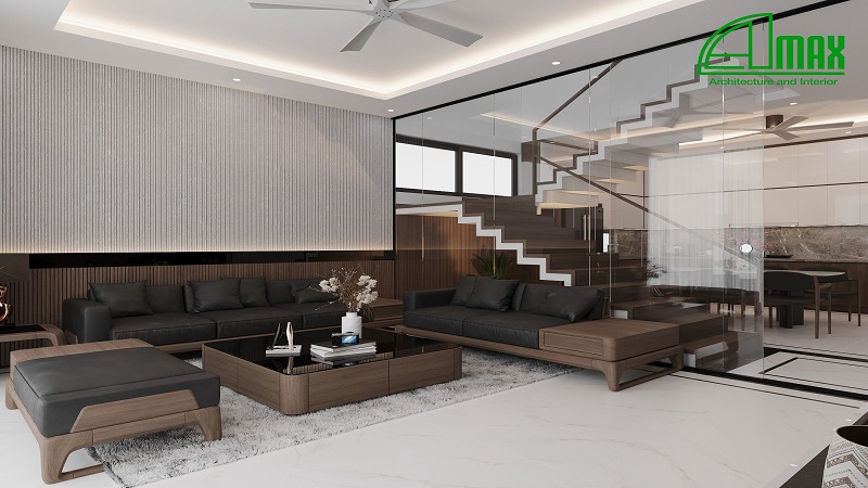 * Cầu thang gỗ óc chó: Mang lại sự ấn tượng với vân gỗ độc đáo.