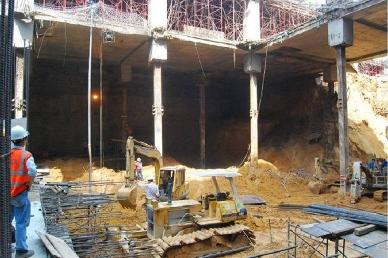 * Sử dụng máy đào đất nhỏ đã chuẩn bị trước để tiến hành đào đất cho tầng ngầm 1.