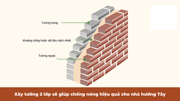 Xây tường hai lớp là giải pháp thông dụng và hiệu quả nhất trong việc cách nhiệt cho các tường hướng Tây. Tường hai lớp bao gồm hai lớp gạch dày từ 110mm đến 220mm với khoảng cách giữa hai lớp từ 100mm trở lên. Khoảng trống giữa hai lớp gạch này giúp luồng không khí lưu thông, làm giảm khả năng nhiệt từ bên ngoài truyền vào trong nhà.