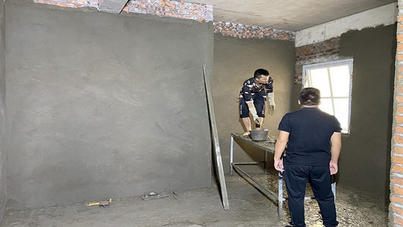 * Kiểm tra tường và nếu có chỗ lõm, bù vữa vào chỗ đó. Nếu có chỗ thừa, sử dụng thước gạt vữa để làm phẳng bề mặt.